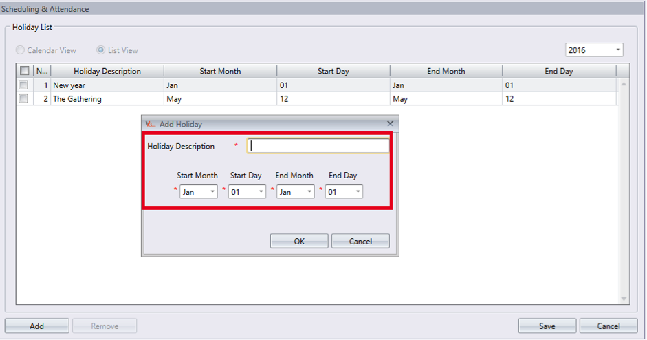 If you are using the List View, you can click on the Add button, and define the Holiday Description and its effective date. |
