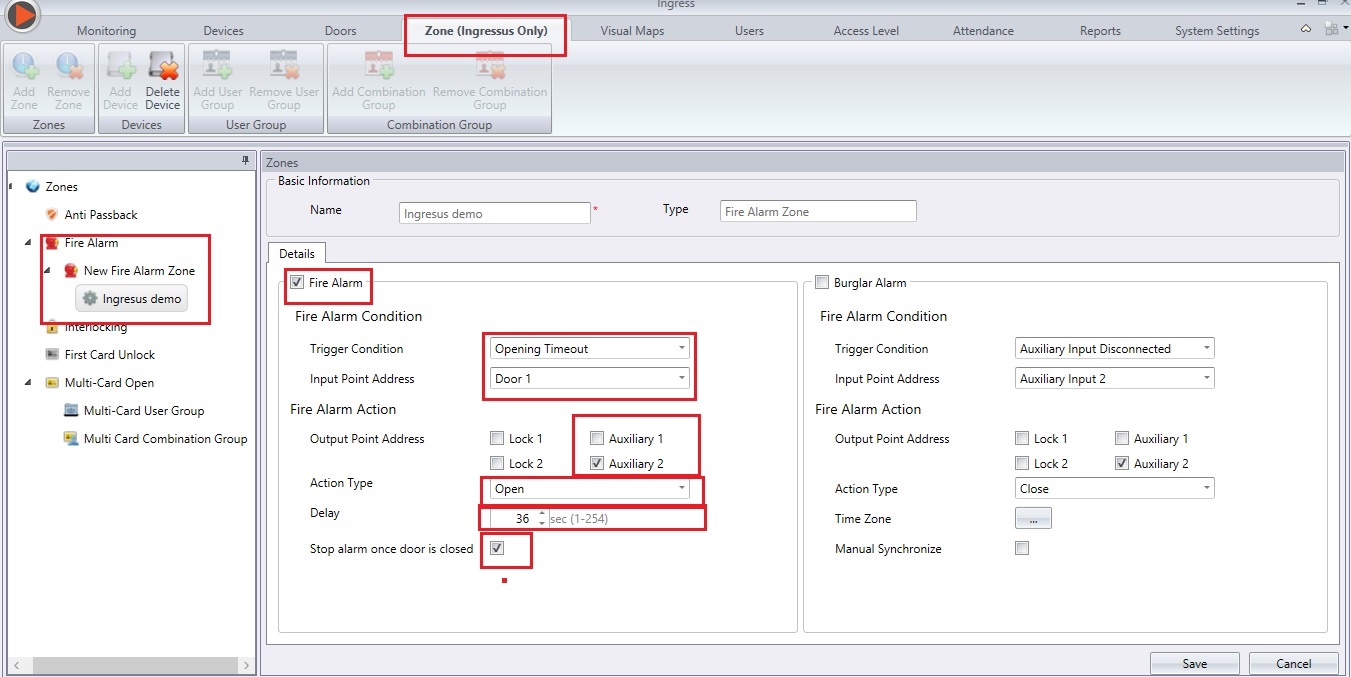 Zone (Ingressus) > Fire Alarm > Right Click > Add Zone > Rename to desired name > Right Click > Select device (Ingressus) > Click at device name > Click “Edit” > Tick at “Fire Alarm” > Set “Trigger Condition” to “Opening Timeout” > Set “Input Point Address” > Tick the desired output at “Output Point Address” > Set “Action Type” to “Open” > Set the “Delay” to desired value (The amount of time the siren triggers) > Tick “Stop alarm once door is closed” > Save > Sync to Device