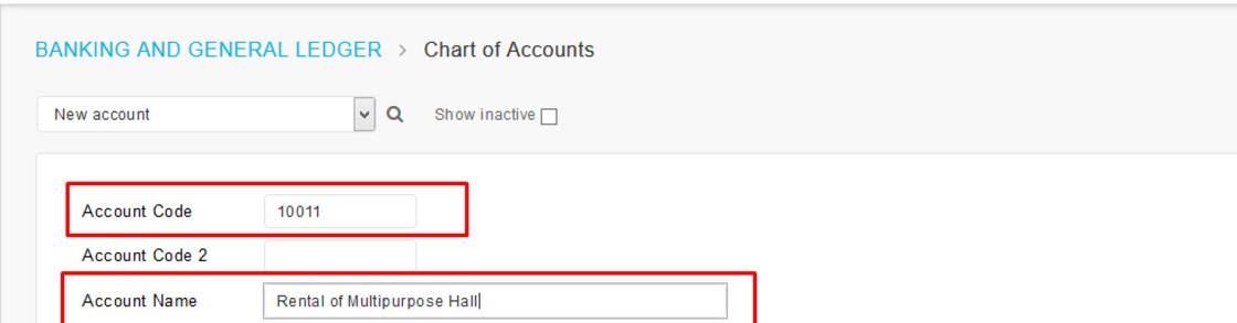 Enter the “Account Code” and “Account Name” for the new GL account. E.g: Account Code is 10011 and Account Name is Rental of Multipurpose Hall.