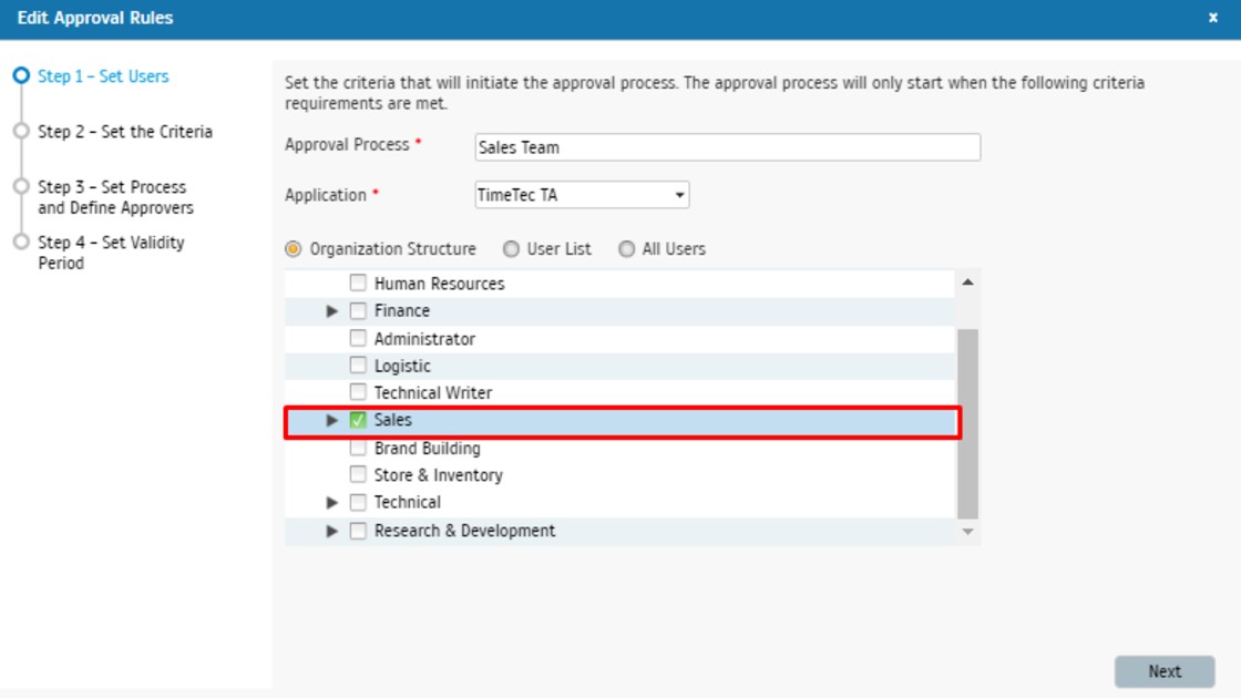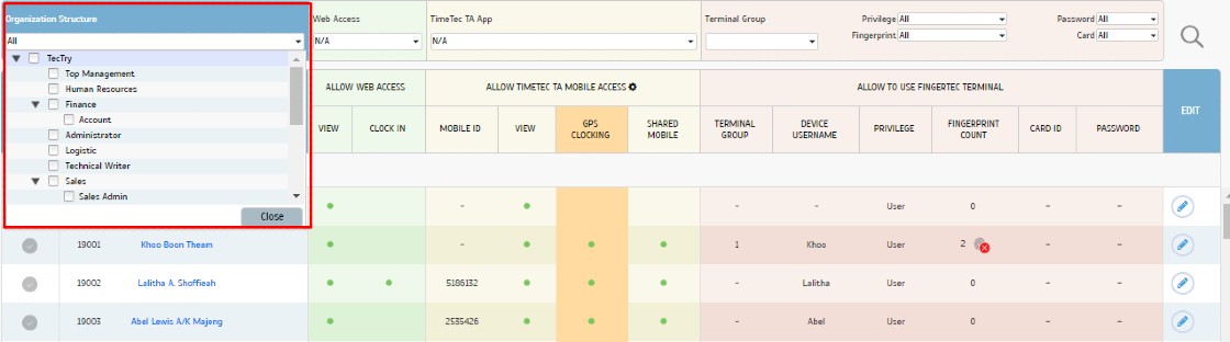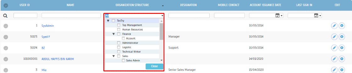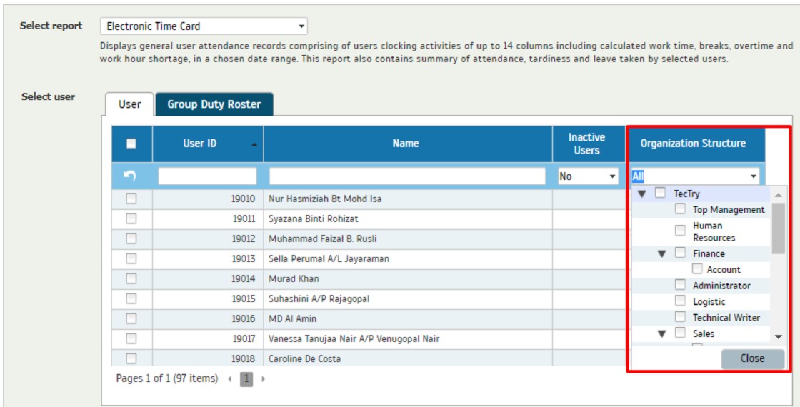 One of the benefits of this Organization Structure tool is the quick & easy filtering. You can select the users by department instead of selecting the user one by one. Refer to the images below to perform filtering by Organization structure in certain modules.