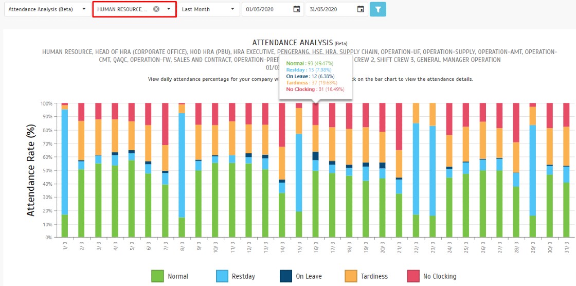 2. Below is an example of the ‘Attendance Analysis’ that was filtered by the Organization Structure tool.