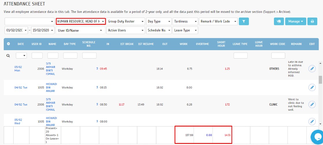 1. Below is an example of a summary attendance filtered by organization structure in the ‘Attendance Sheet’ page