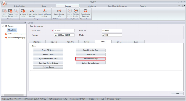 IntroductionTCMS V3 is a Time Attendance Aystem that runs on Microsoft Operating System. On top of its other functions, TCMS V3 also manages your devices’ administrator privileges.BenefitsWhen an admin resigns or losses his verification information, FingerTec devices couldn’t be accessed by unauthorized personnel. This feature allows you to remove admin privilege using TCMS V3. To clear a terminal's administrator privilege, follow the steps below.Step 1Click Devices > Click the terminal you want to remove the administrator privilege.Step 2Click at Other > Click Clear Admin Privilege.