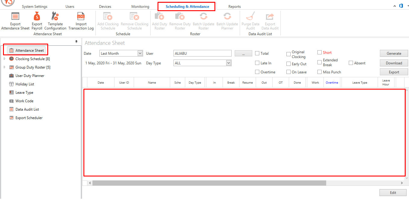5. Check the Clocking Schedule setting. Please make sure you have configured your clocking schedule correctly. If you already configure the Clocking Time correctly, the Attendance record with employee name and date should appear in the Attendance Sheet after you Generate the record.
