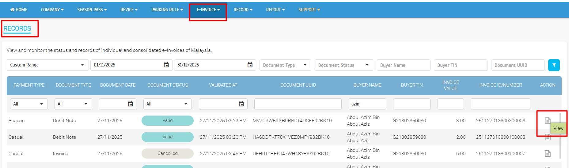 - Go to E-Invoice tab > Record and filter date based on payment record