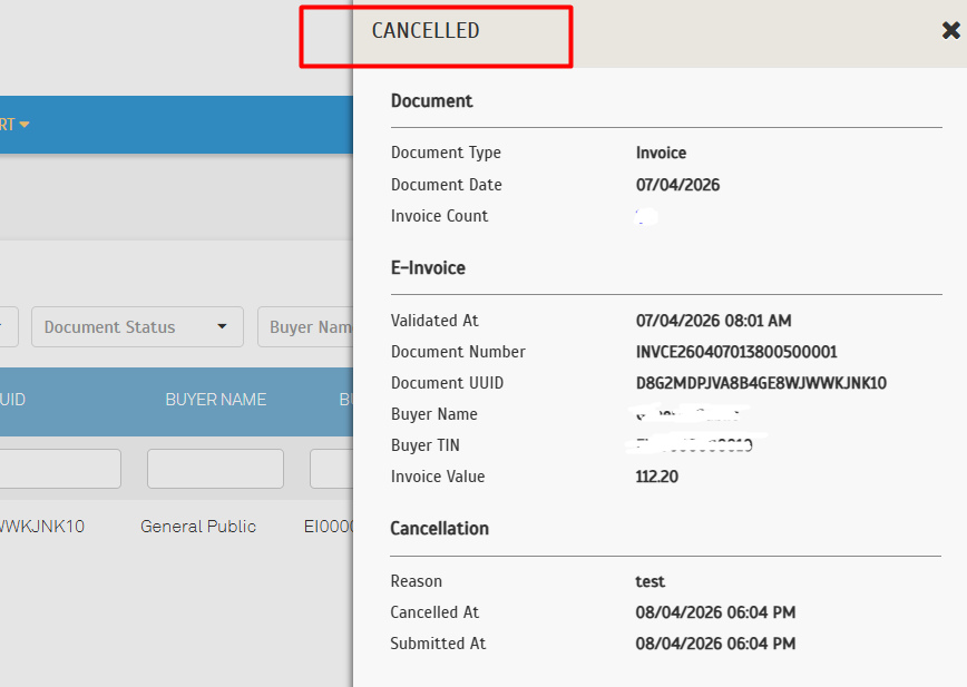 - E-Invoice record status will change to 'Cancelled'