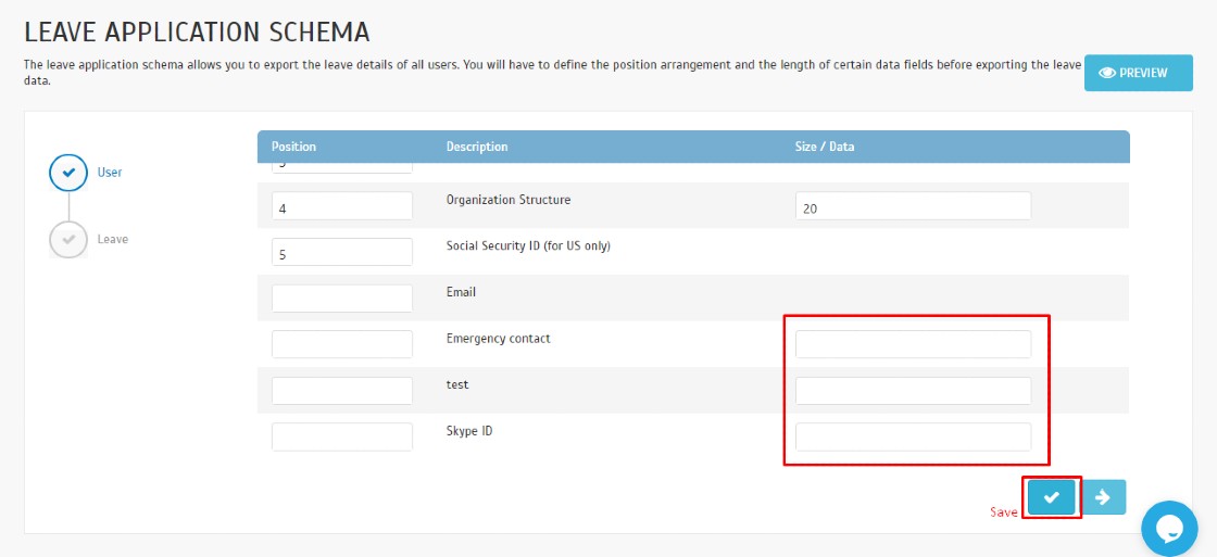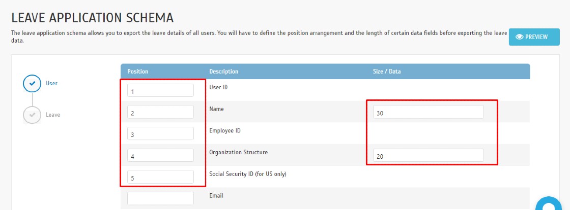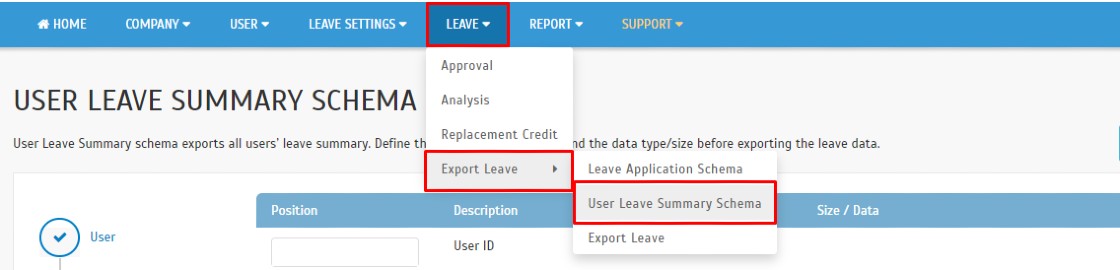 User Leave Summary schema exports all users’ leave summary. Define the position arrangement and the data type/size before exporting the leave data.