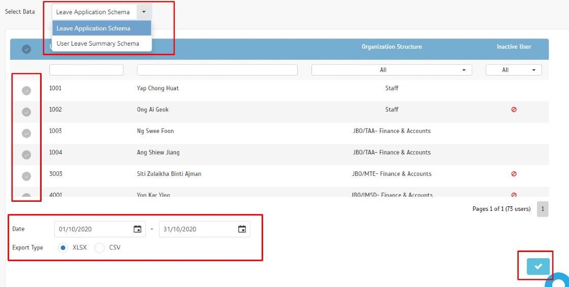 3) At the Export Leave Module click on Select then choose >select the date range and Users > Submit.