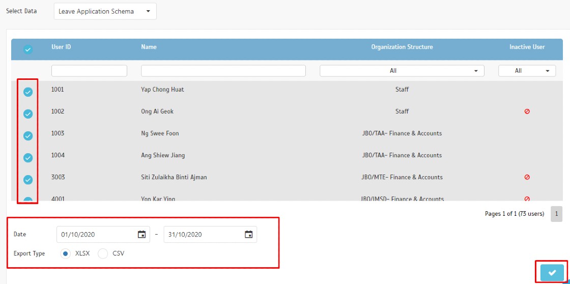 4. When the data field Position and Size are set, press Save to be directed to the Export Leave module. From the Export Leave Module, Select the Date Range, and User ID(s), then click on the “Submit” icon, the system will generate the export file based on your choice.