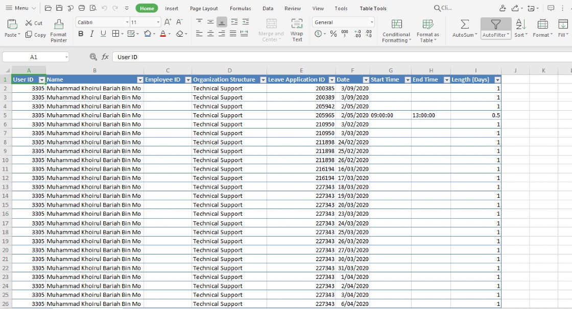With the leave application schema you can export the leave details of all users. You will have to define the position arrangement and the length of certain data fields before exporting the leave data.