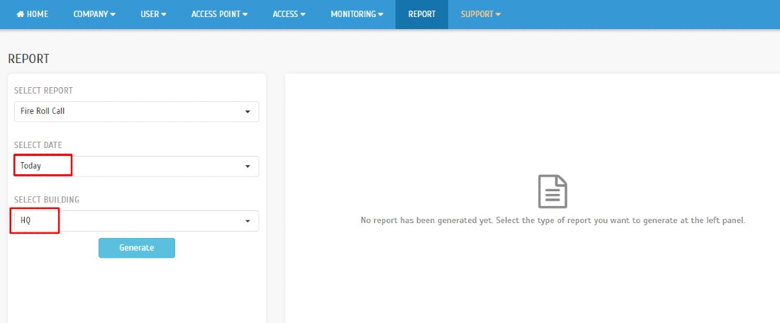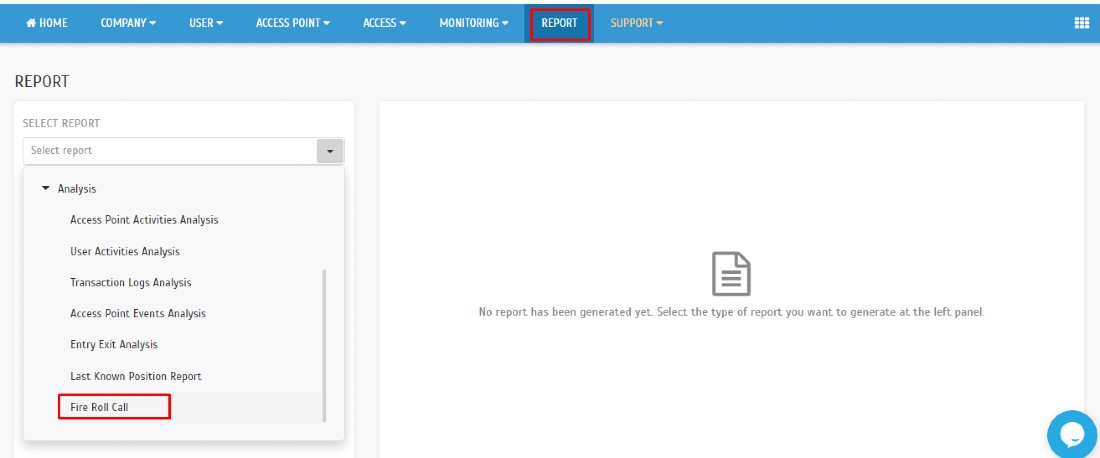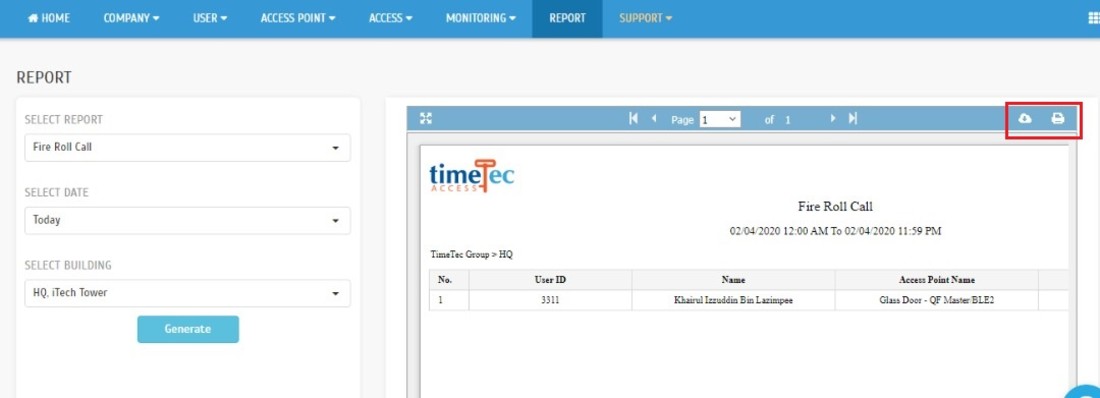 Step 4 - Generate Fire Roll Call report in TimeTec Access by going to Report > select Fire Roll Call report.