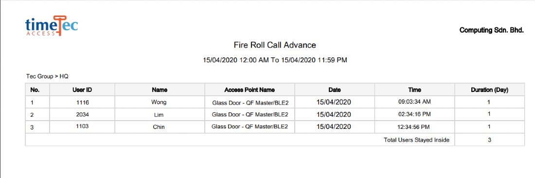 However, do take note that this Fire Roll Call report only works if you install an In-Out reader system. The In-Out reader system is a system where you have records of all users who enter and exit the access points (exit push button does not work in this case).
