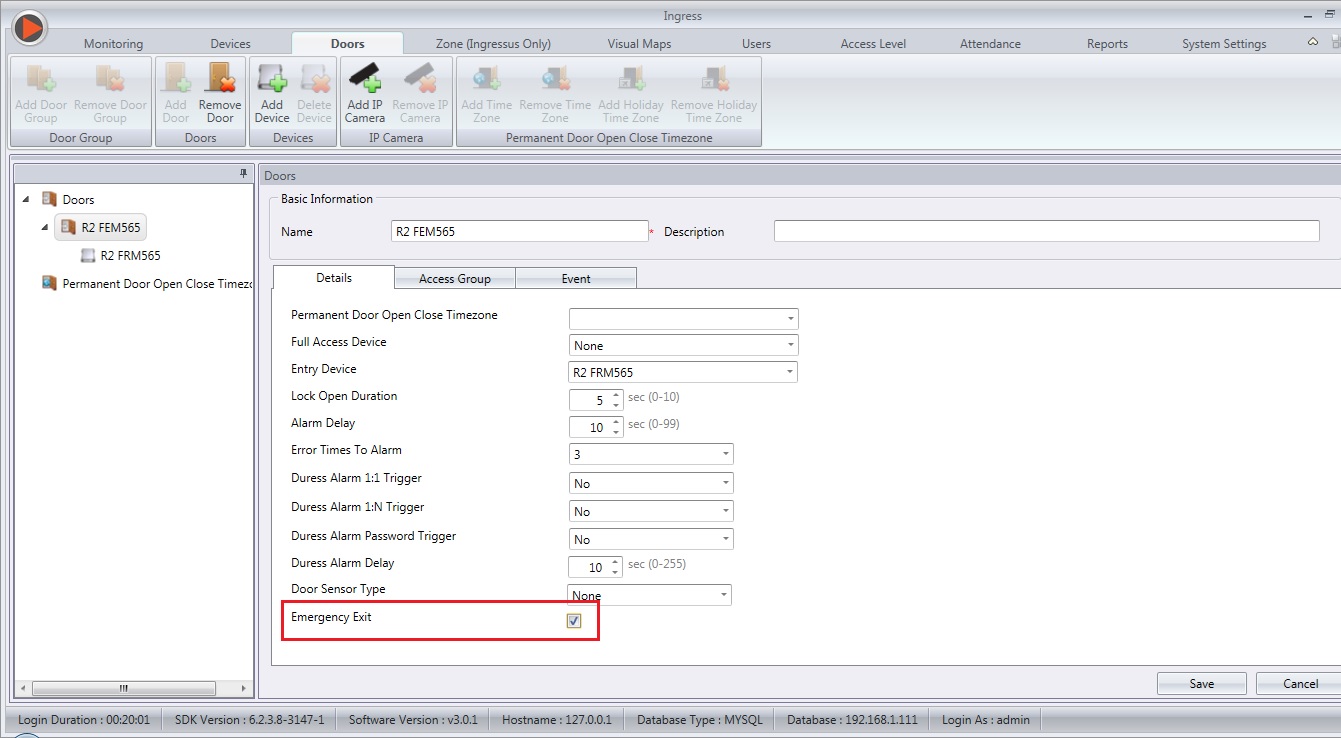 2. Next, you must assign one device as Emergency Exit for every door. To do this, at the ‘Doors’ > ‘Details’ tab, select one of the devices as ‘Entry Device’. Following that, tick the option ‘Emergency Exit’ and click Save, then sync it with the FingerTec Terminals.