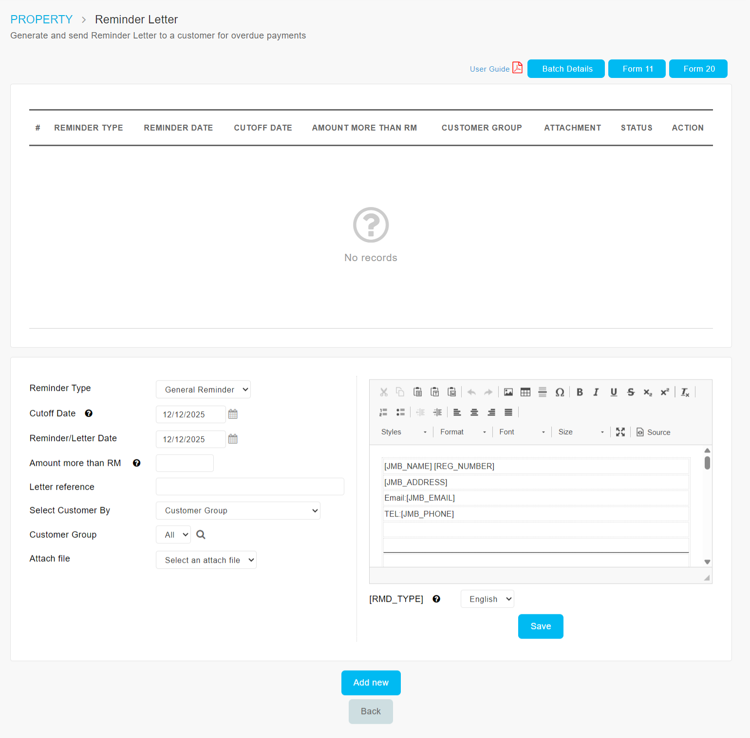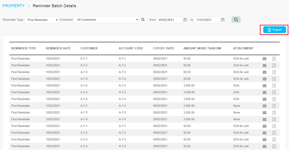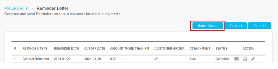 Users can click manually to send email for the whole batch. Email can be sent multiple times. Date(s) of email sent is displayed when user hover over the icon, for instance: 01/01/2021 15/01/2021 | |