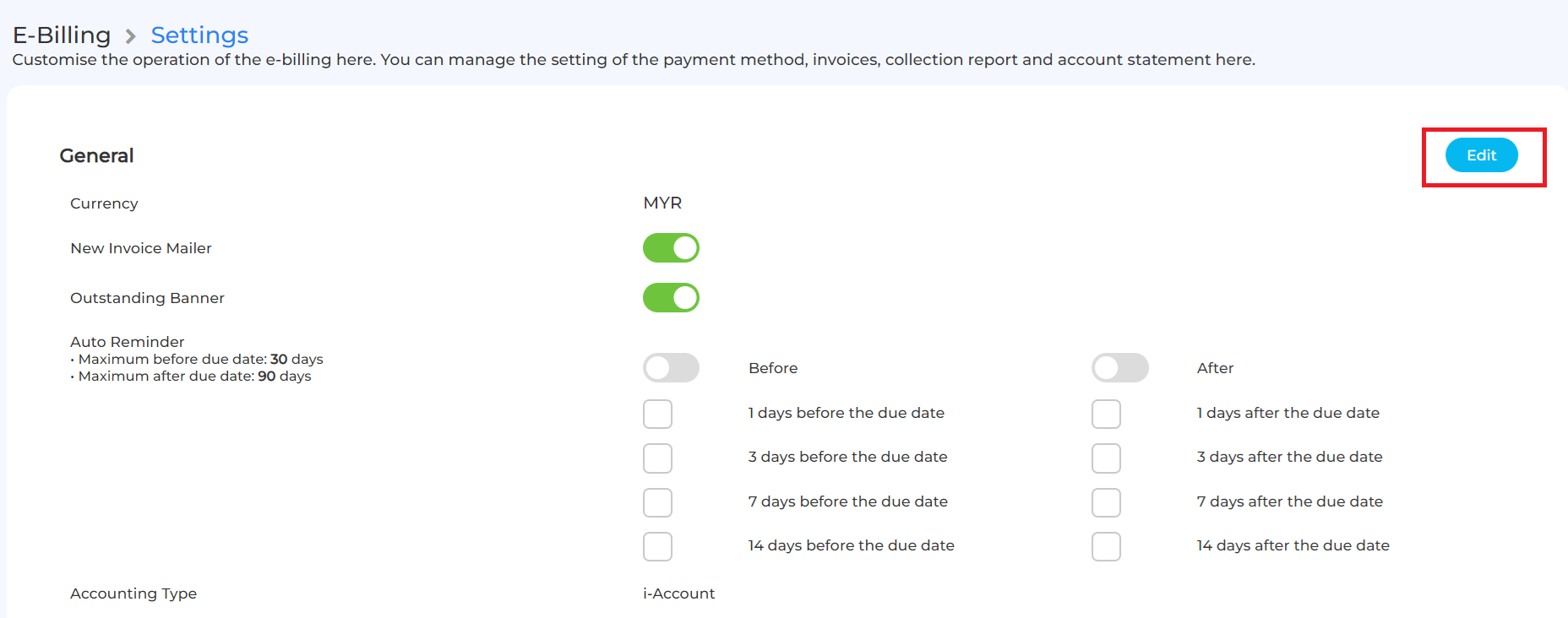 On the E-Billing Settings page, click the Edit button in the top right corner to unlock the configuration fields.