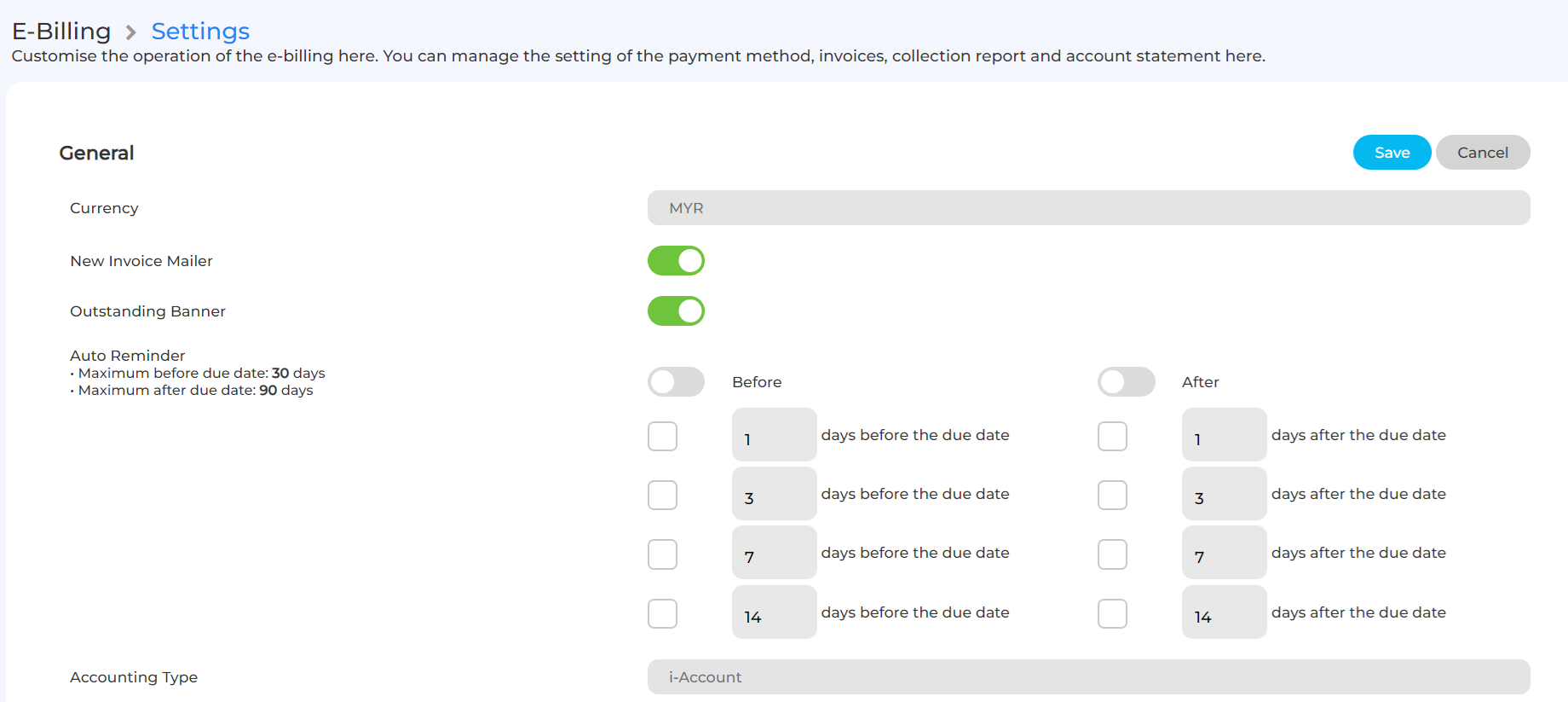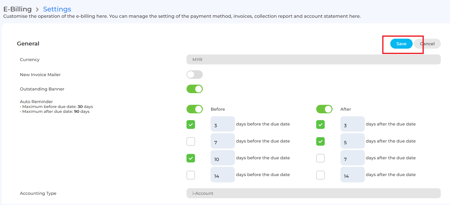 Only Admin users that are assigned with permission to edit E-Billing settings are able to edit the auto reminder setting below.