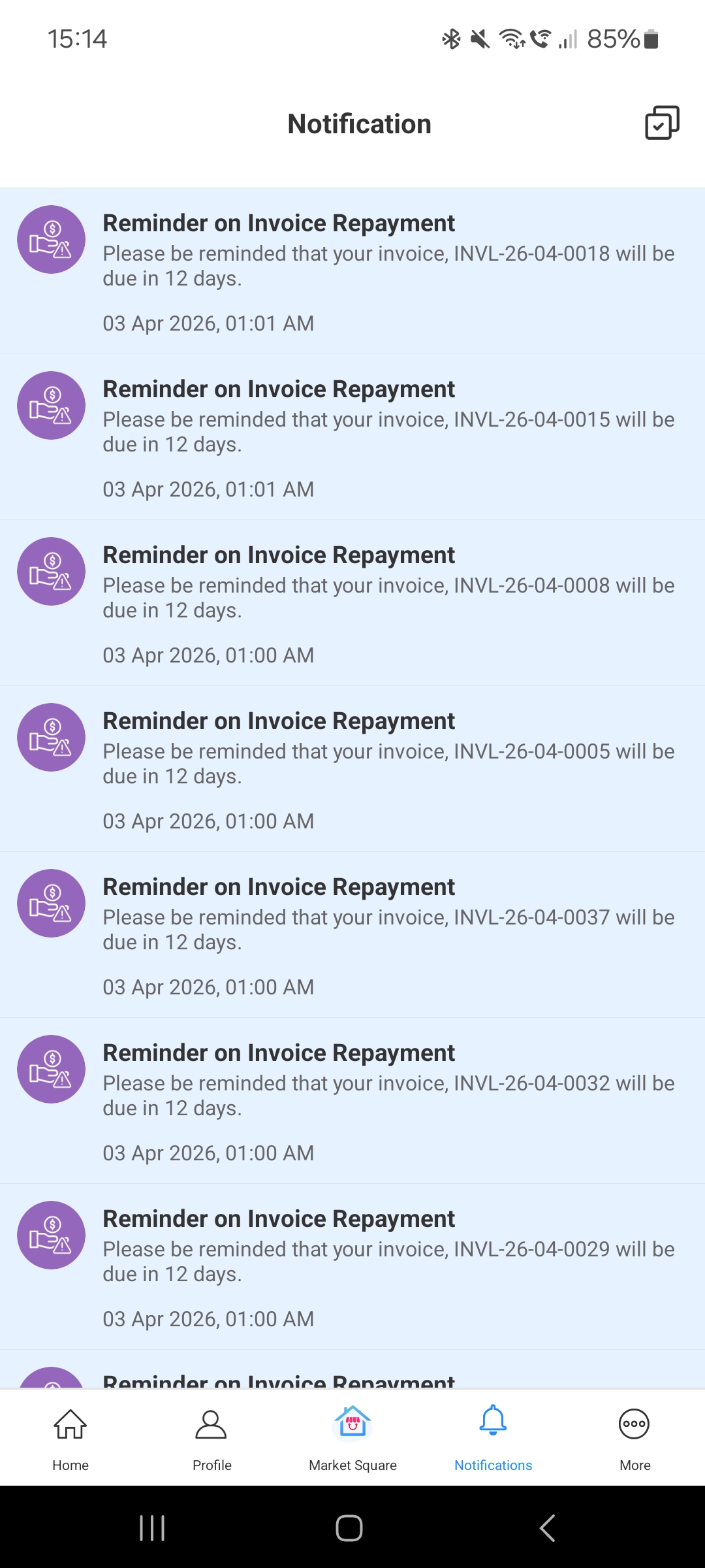 On the resident's app, a "Reminder on Invoice Repayment" notification will be sent, specifying exactly how many days remain until the due date or the number of days overdue for each specific invoice number.