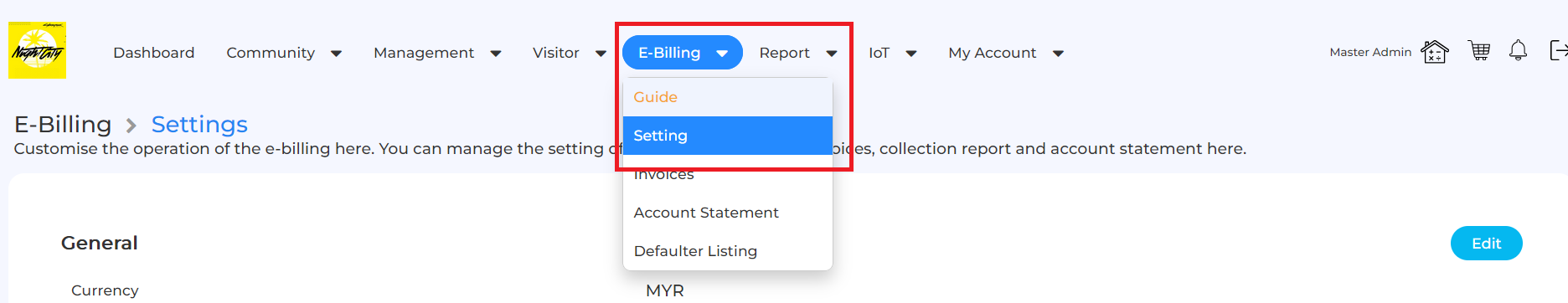 Navigate to the top menu bar and select E-Billing. From the dropdown menu, click on Setting.