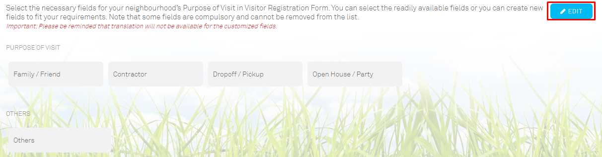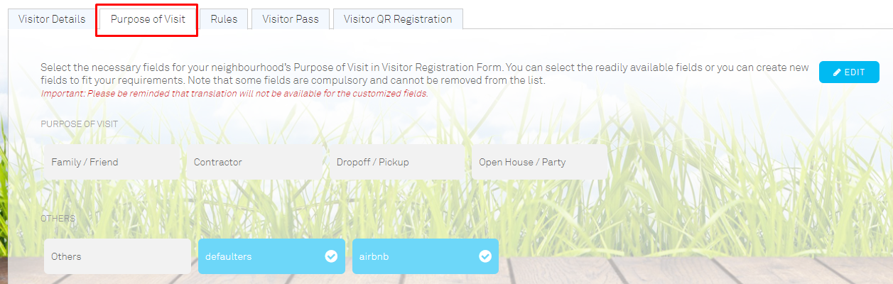 The management or the resident association can create the purpose of visit based on their desired preferences for the neighbourhood.
