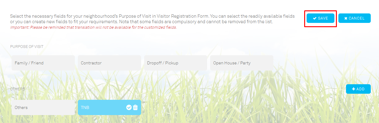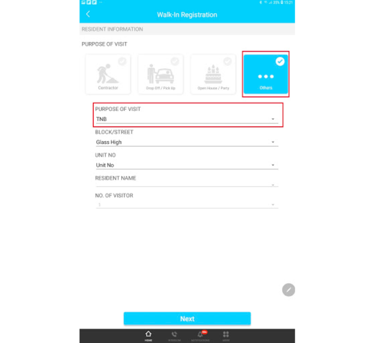 6. Under the Purpose of Visit that has been set up, the guards will be able to register the distinct purposes of visiting using the Others as an option.