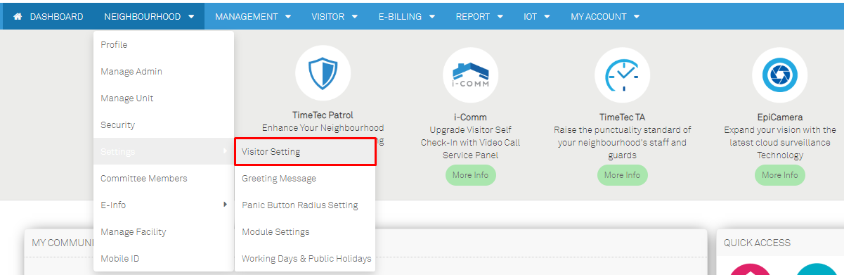 1. Under Community > Setting, click on Visitor Setting5. The final step is to ensure all changes are synced properly onto the i-Vizit (guard tablet) so that it will all appear for future visitor registration.a) Click the Synchronize icon located at the top-left of the screen.