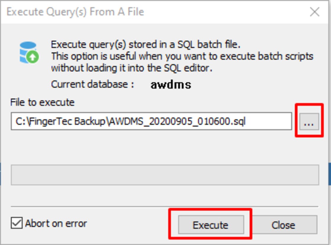 2. Click the “…” icon to select the backup file path. Click Execute to restore the database.