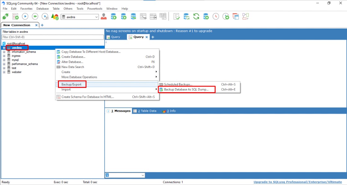 2. After successfully installing the SQL Community, please run the software to connect with the MYSQL database. First, you need to fill the required Host address, Username and Port of the MYSQL database. Then, click on Test Connection and Connect.3. Upon connecting to the localhost database, you should see on the left panel of the window a list of the available databases. Next, right click on AWDMS and select Backup/Export and Backup database as SQL Dump.