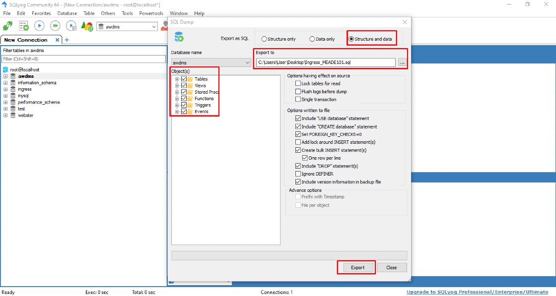 4. Click on Structure and Data > Select ALL Object(s) > Choose folder to store the database > Now that the settings have been configured, click 'Export' to start the backup process. The program will inform you when it is completed.5. Now, you need to copy one folder that contains a user photo for backup purposes in case there is no user photo available once you restore the AWDS backup database on a different PC.
