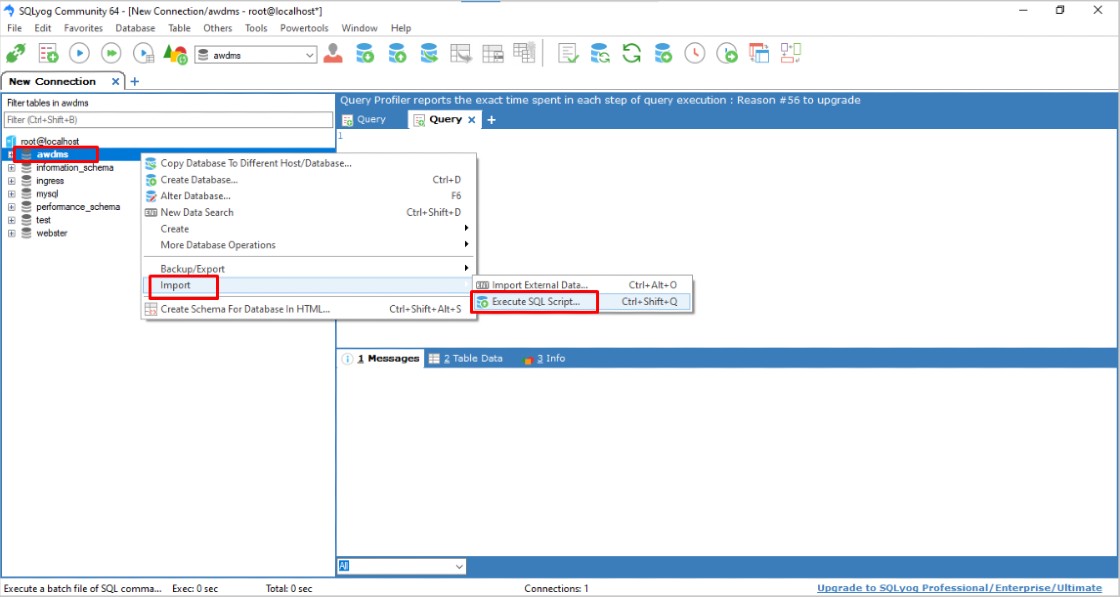 1. At the SQLyog Community software, connect into the localhost database. Right click on AWDMS, select Import, and then Execute SQL Script.