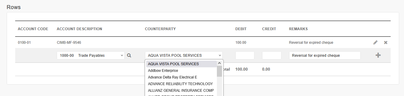 4. If a General Ledger (GL) account either Accounts Payable or Accounts Receivable is selected, an additional column labeled “Counterparty” will appear, allowing you to select either a supplier name or a unit number.