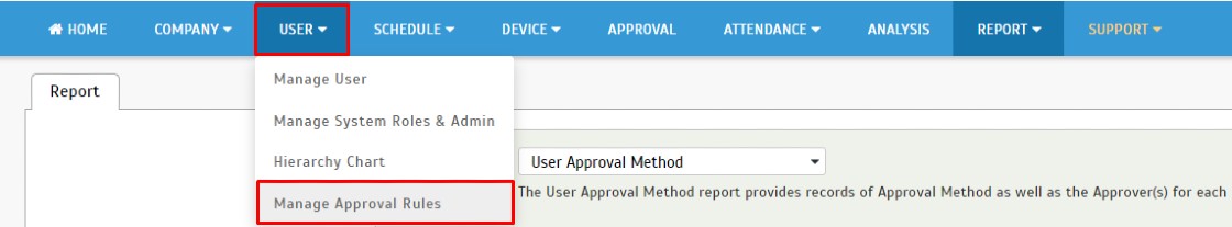 1. Go to Timetec TA > USER> and click on Manage Approval Rules