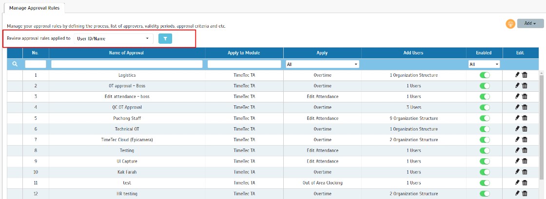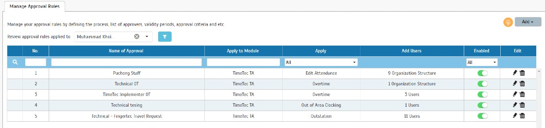 TimeTec TA has enhanced the option Manage Approval Rules that lets the admin check user approval information and sort the user based on their managed approval settings. The information can be found in a module directly to the setting individually and multiple users from the report. Below are the steps on how to search for user manage approval rules information in TimeTec TA.