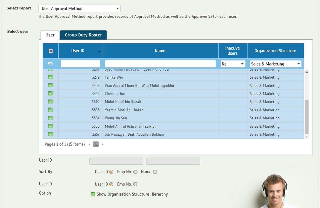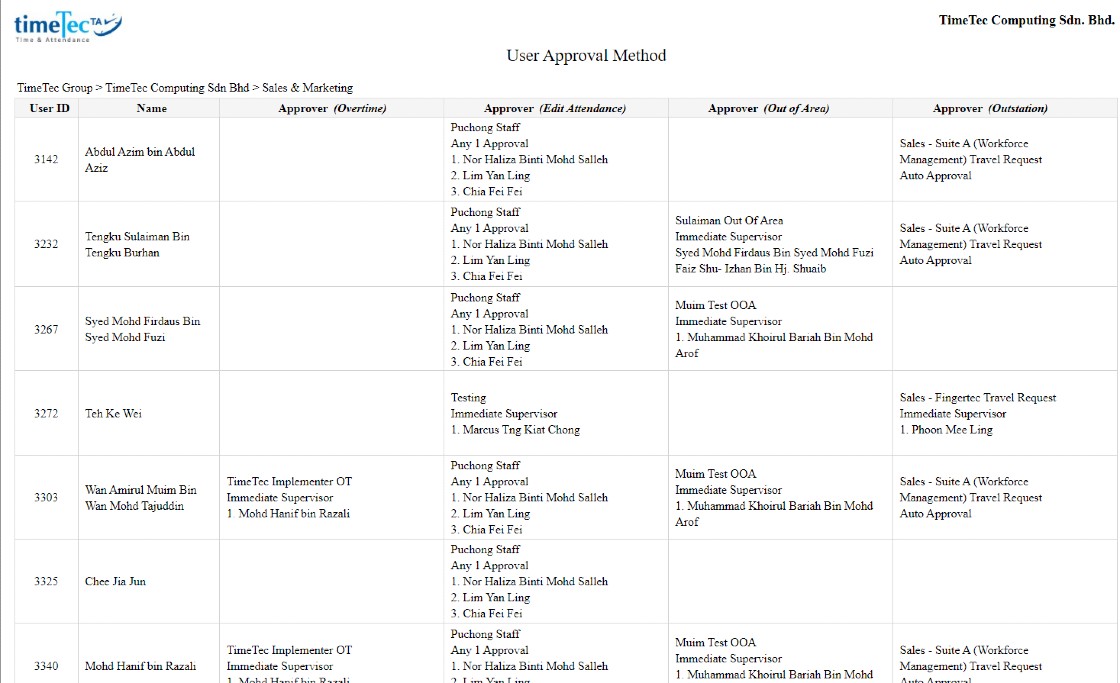 Multiple users manage approval rules setting can be extracted from the report in TimeTec TA.3. Go to TimeTec TA > Report > Itemize Report > and choose User Approval Method.