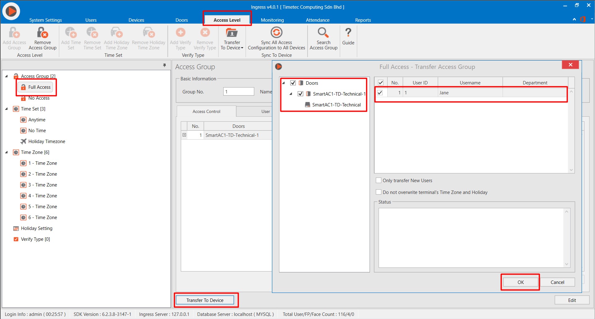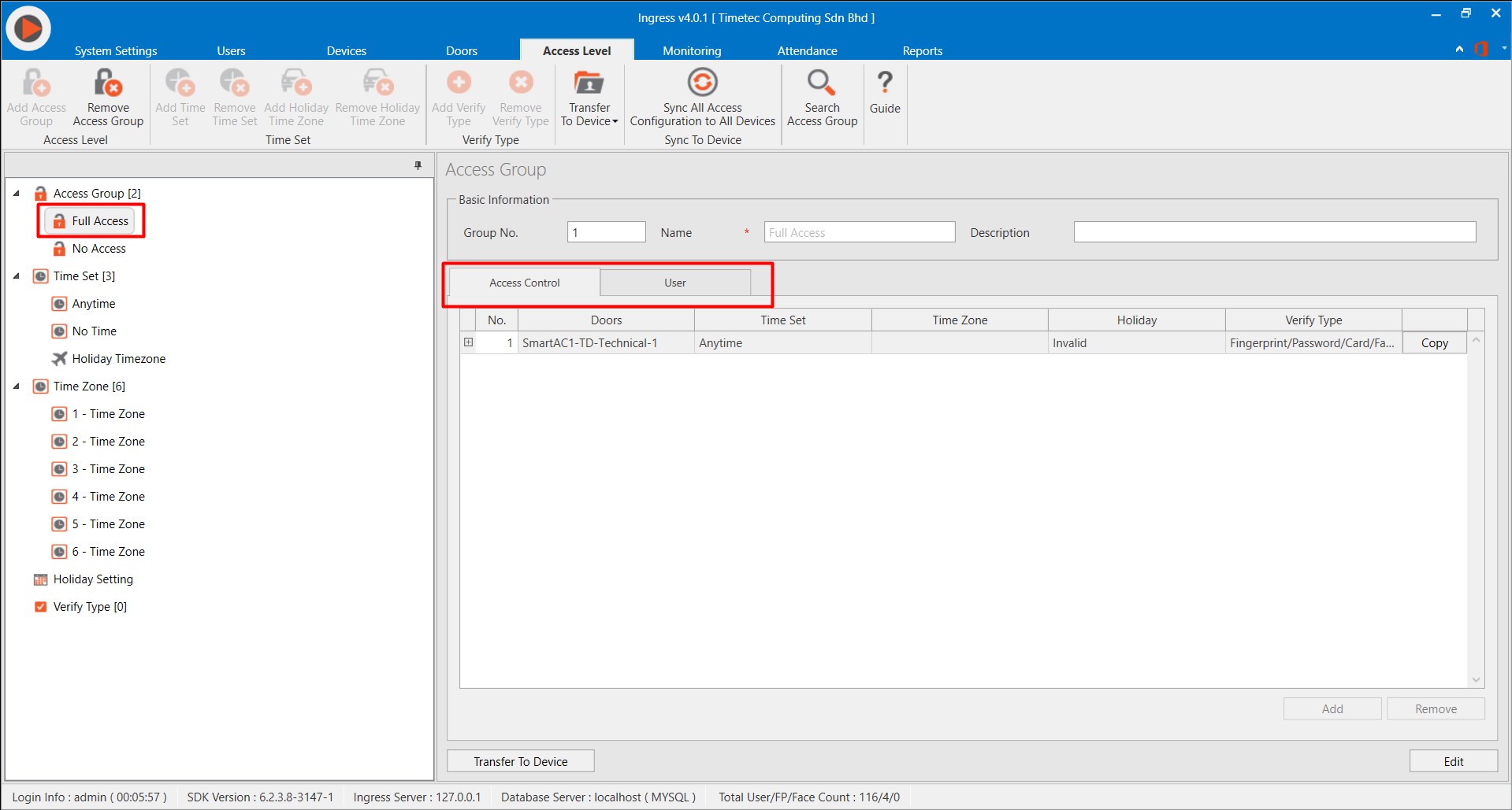 Click on the Access Level tab in the Ingress software > Select Full Access > Assign Smart AC door and the newly created user to this group.
