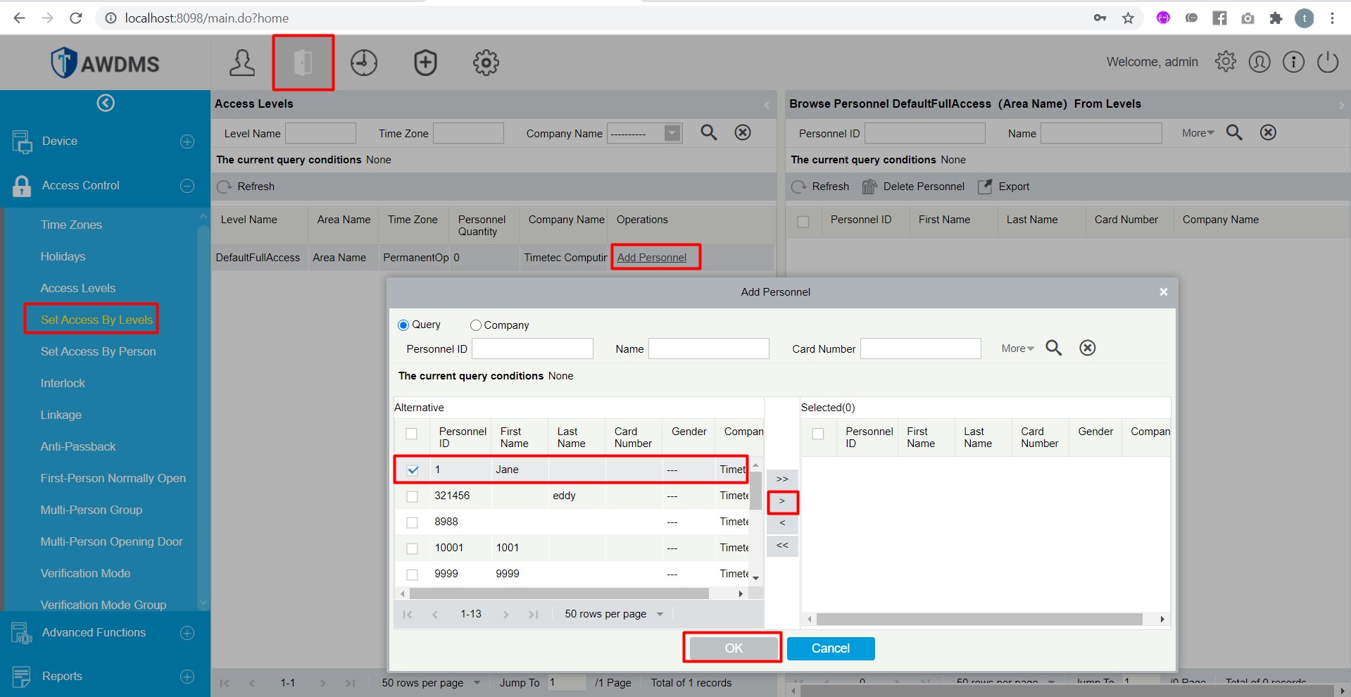 6. Select Add Personal to access Assign User in the AWDMS with this Access Level. Then, select the newly created user and click on the right arrow button.