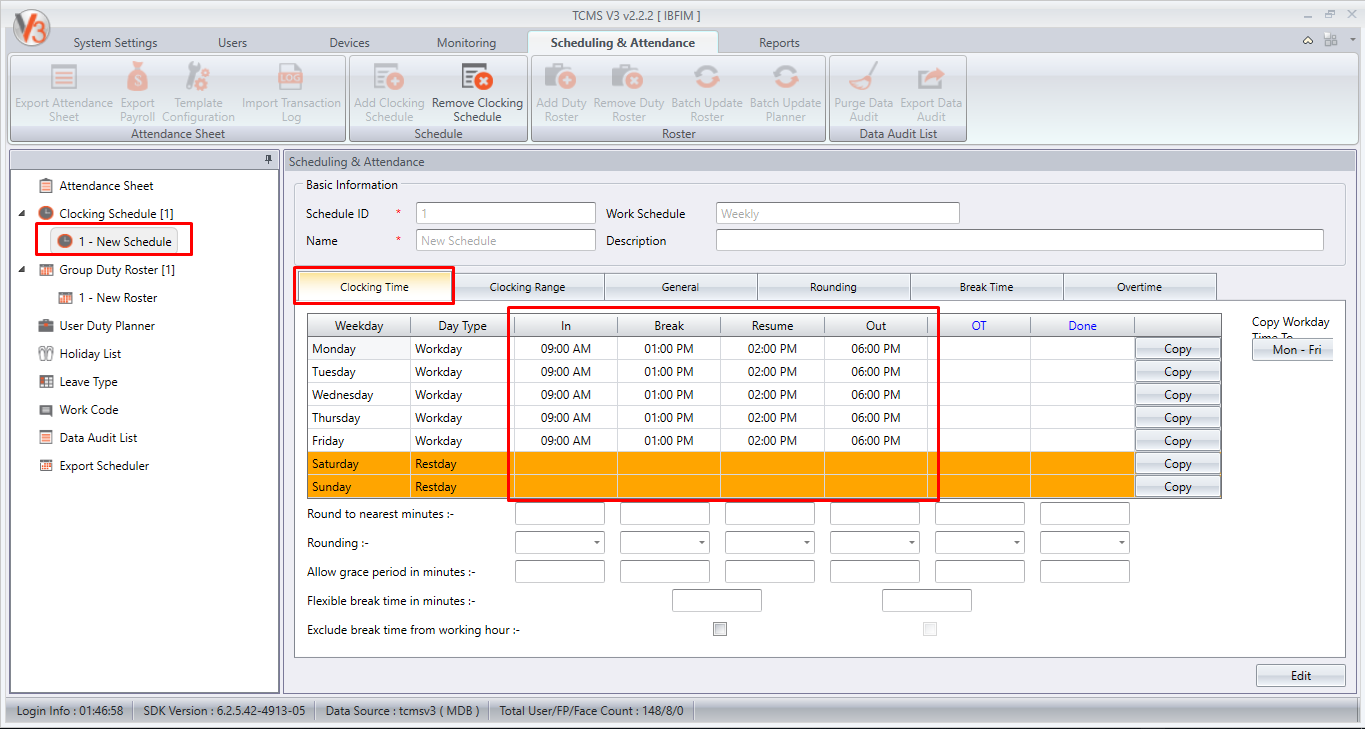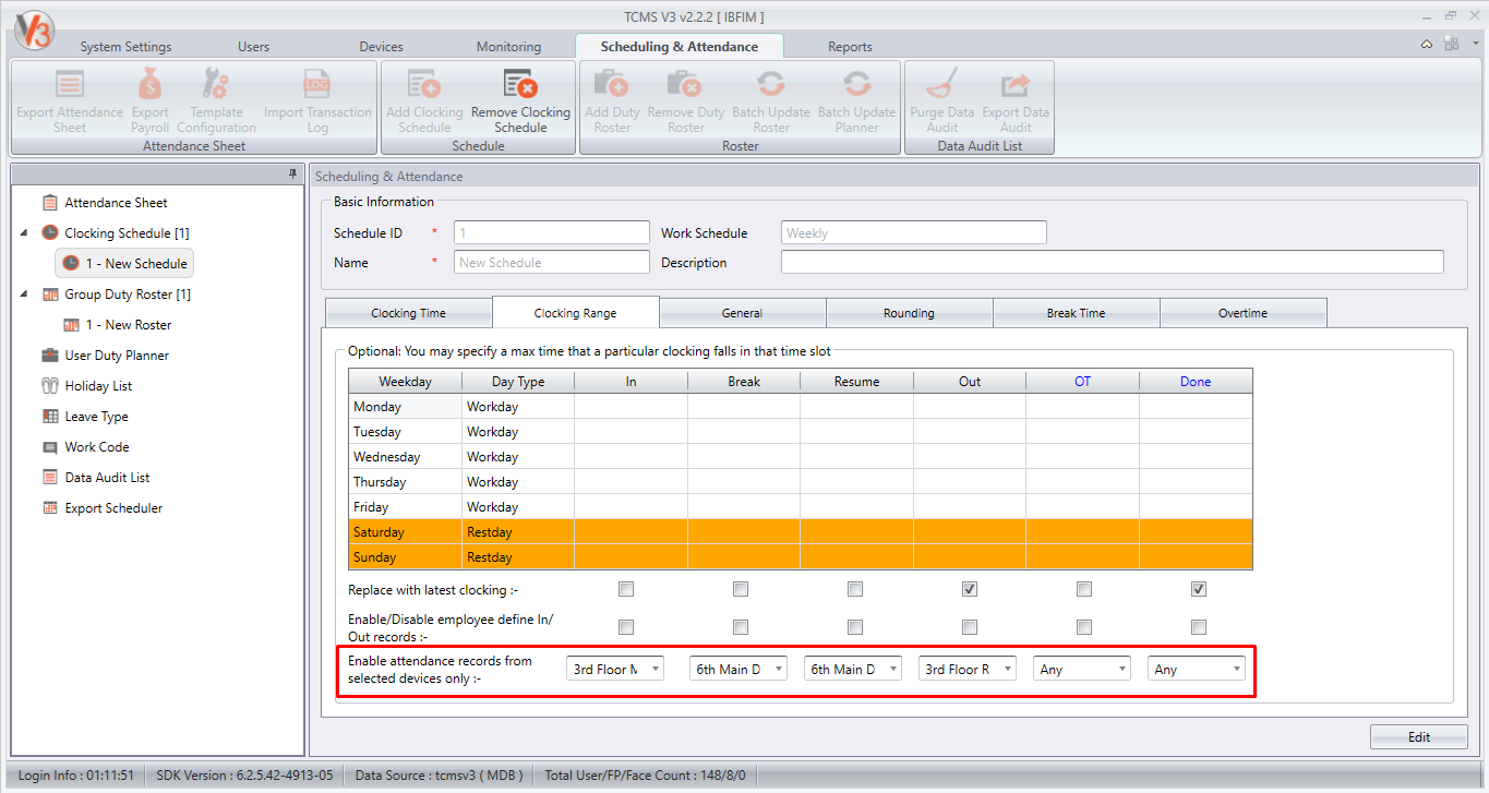 IntroductionWhen dealing with many devices such as Time Attendance and Door Access, TCMS V3/ Ingress software will record every clocking activity of the staff involved. But certain companies want the system to capture the clocking time for attendance from certain devices only.In order to accomplish that, TCMS V3/ Ingress software provides an option for users to take no account of the clocking activities from other devices that are not set up as the time attendance devices. When you set this option, the attendance sheet will only capture the clocking activities from the selected devices and store in the attendance record.ProcessTherefore, we have prepared a guide for users to enable the attendance record from the selected device. Please follow the quick steps below:1) Go to Scheduling & Attendance > Clocking Schedule > Add Clocking Schedule > Key in the Schedule ID > Name > Select Work Schedule (Weekly/Flexi/Daily).2) Set the clocking time for the schedule (In, Break, Resume, Out, OT and Done).3) Go to Clocking Range > Enable the attendance record from selected devices only > Tick the device name that you want the attendance record to be captured for each column. Please make sure you already add and activate the device in order for the device to appear in the list.Note: If some of the screenshots or steps viewed here are different from the ones in the current system, this is due to our continuous effort to improve our system from time to time. Please notify us at info@timeteccloud.com, we will update it as soon as possible.