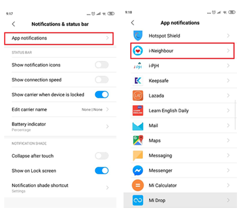 3. Tap on the App notifications to see the apps list.4. Search and select i-Neighbour.