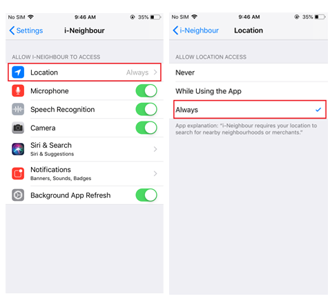 5. Enable the Location to activate the GPS function for i-Neighbour.
