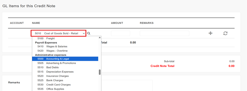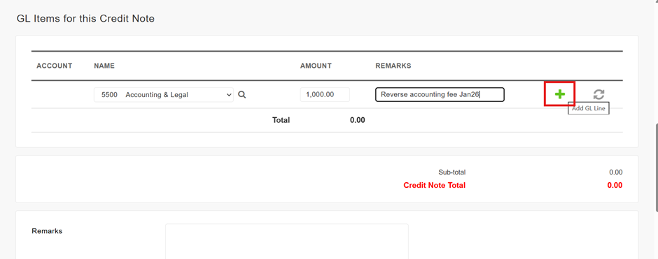 3. Scroll down to the “GL Items for this Credit Note” section. Select the relevant GL Account from the Name dropdown list and enter the Amount. Enter a Remarks for this particular GL item line (optional), then click the (+) icon to add the GL item line. Repeat this step to add as many GL item lines as necessary.