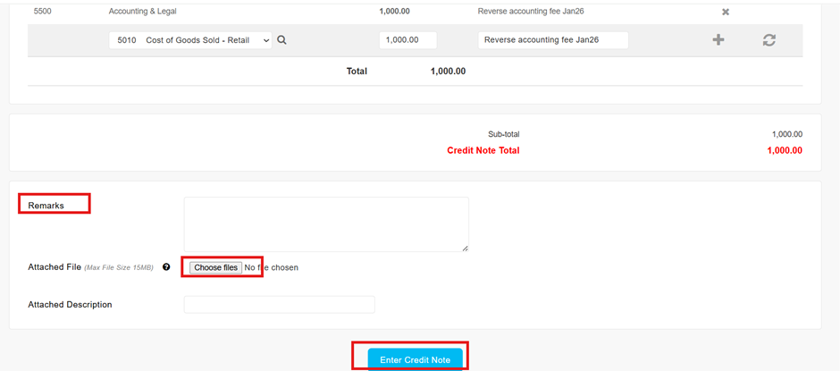 4. Admin can also choose to enter a memo in the Remarks column at the document level or upload a document using the Attached File function. Finally, click the “Enter Credit Note” button at the bottom to save the transaction.