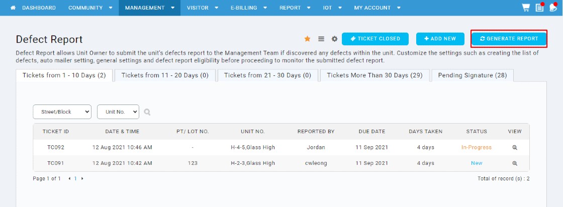 This article is a guide for an Admin to manage the Defect Report module. How to View and Update A Defect Report on the Web: Step 1: Go to Defect Report, and you can view all lodged defect tickets. The number of days the tickets submitted determines ...