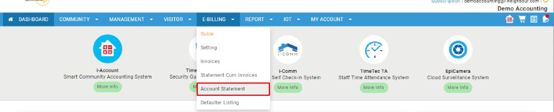 Login to i-Neighbour website and go to e-Billing module > Account Statement.