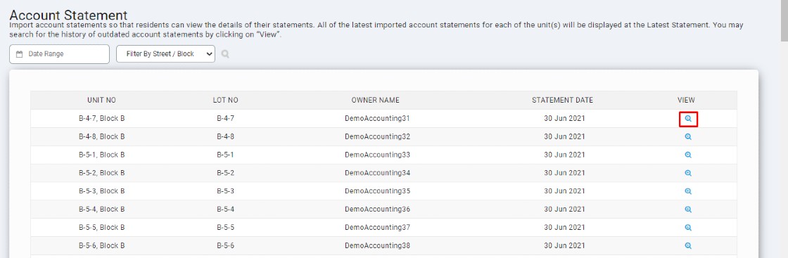 All the uploaded Statement of Account will be displayed on this page and Admin can filter according to their preference. Admin can click the “View” icon to view the Statement of Account.