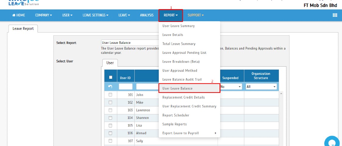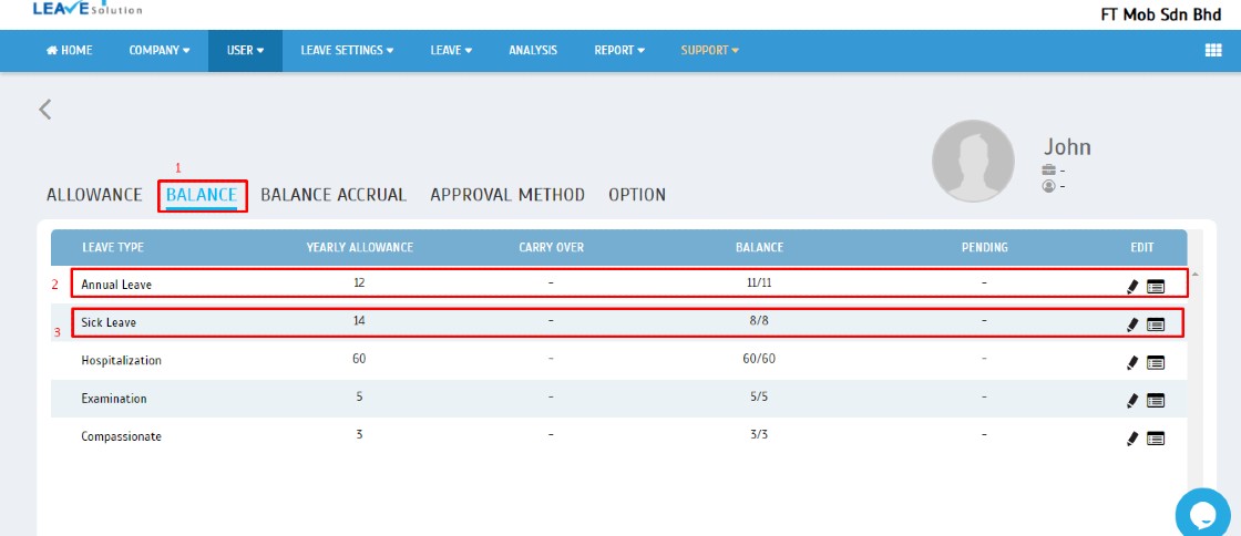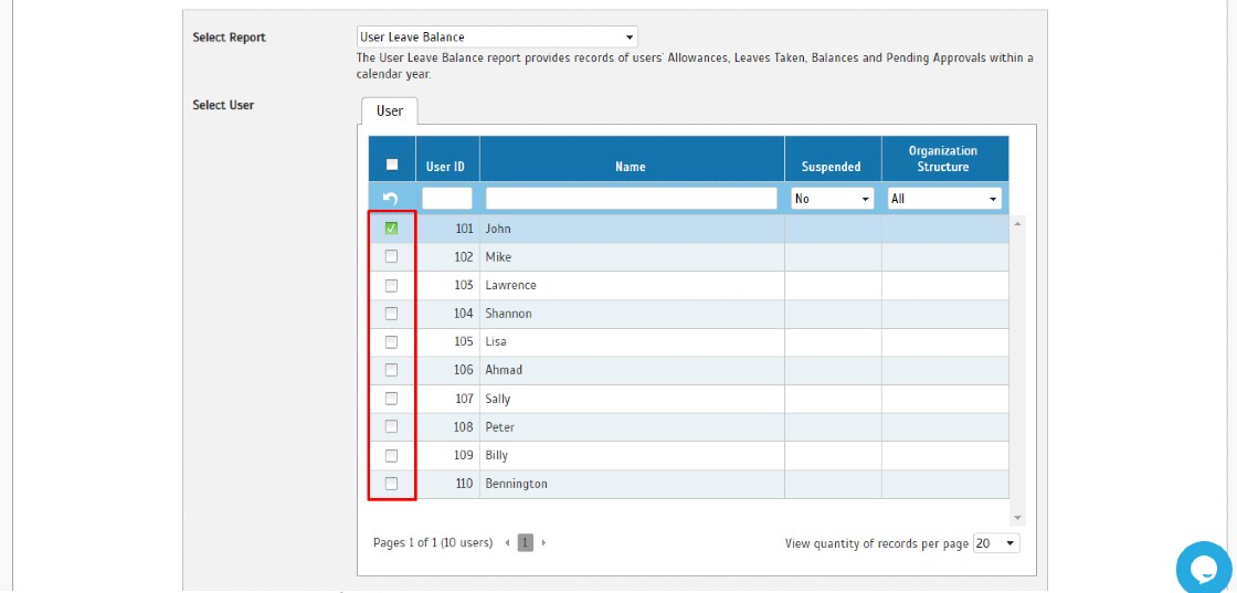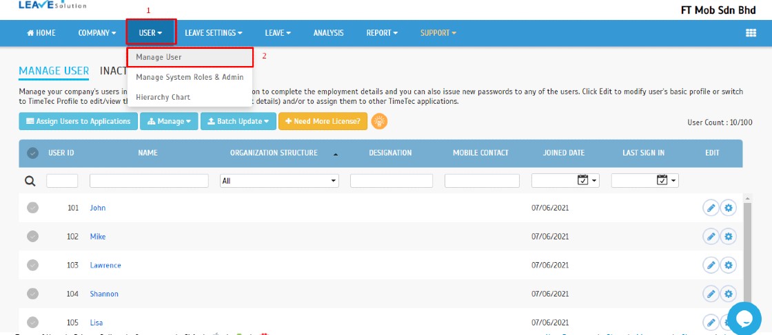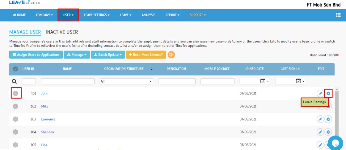 1. Go to User > Manage User > Select User > Leave Settings (Gear Icon).