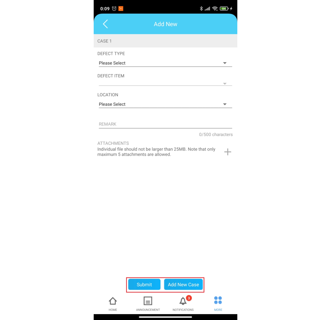 Step 4: Fill in the defect information and Submit. Click on ‘Add New Case’ to lodge more than one (1) ticket.