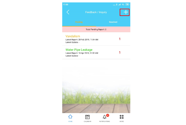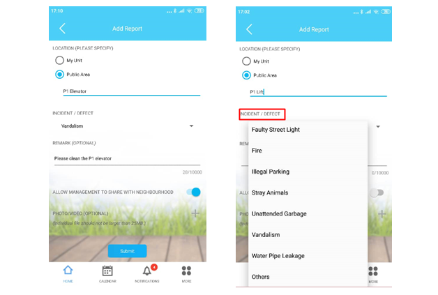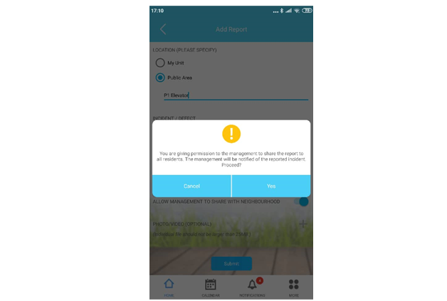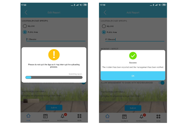 Step 2: To lodge a new Feedback/Inquiry, tap on the ‘+’ iconStep 3: Add feedback report3.1 - Specify location (My unit or Public Area). For public area, please specify the exact location, for example, P1 Elevator3.2 - Select incident / defect type3.3 - Put some remark (optional)3.4 - User can toggle on/off button whether to allow management to share within the neighbourhood community3.5 - User can also attach some photo/video (not larger than 25MB) Step 4: Click Submit to proceed4.1 - If you turn on ‘Allow management to share with neighbourhood’, the system will ask for a second confirmation check for your permission to share 4.2 - Then system will upload the feedback/Inquiry