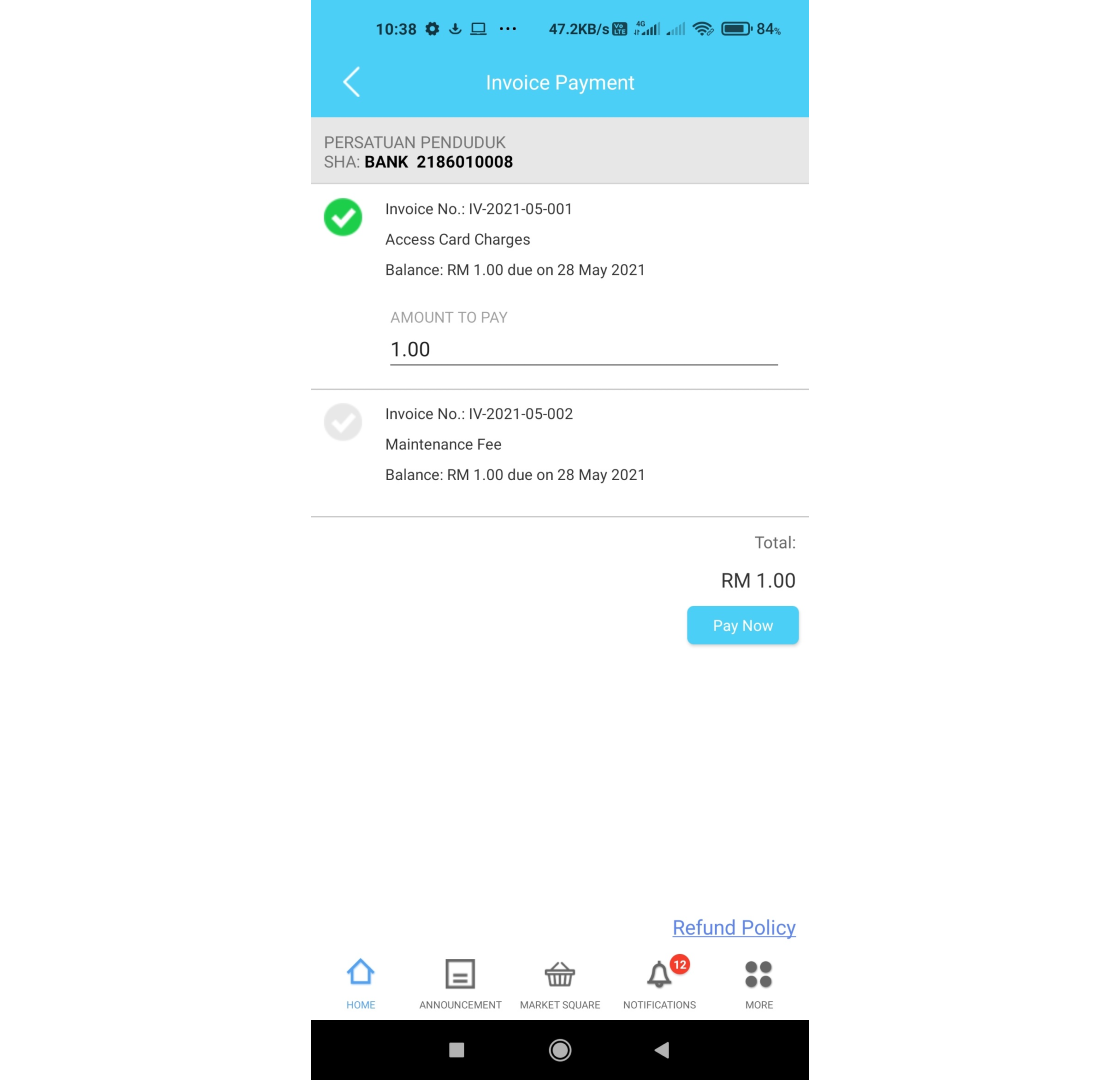 This article aims to teach users how to make payments using the i-Neighbour mobile app. 1. Click on E-Billing 2. Click on the selected invoice. 3. Owner can now view the invoice details. To get the original invoice, click on the blue invoice number. ...