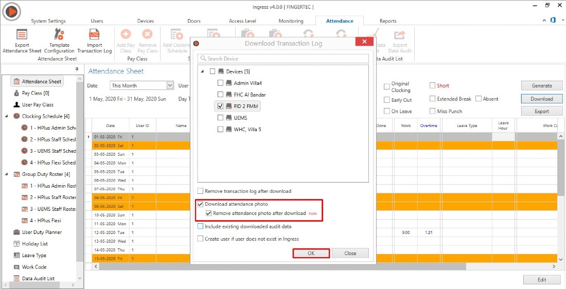 Go to the Attendance tab > Attendance Sheet > Click Download > Select the device > Tick Download Attendance and Remove Attendance Photo After Download option > Ok