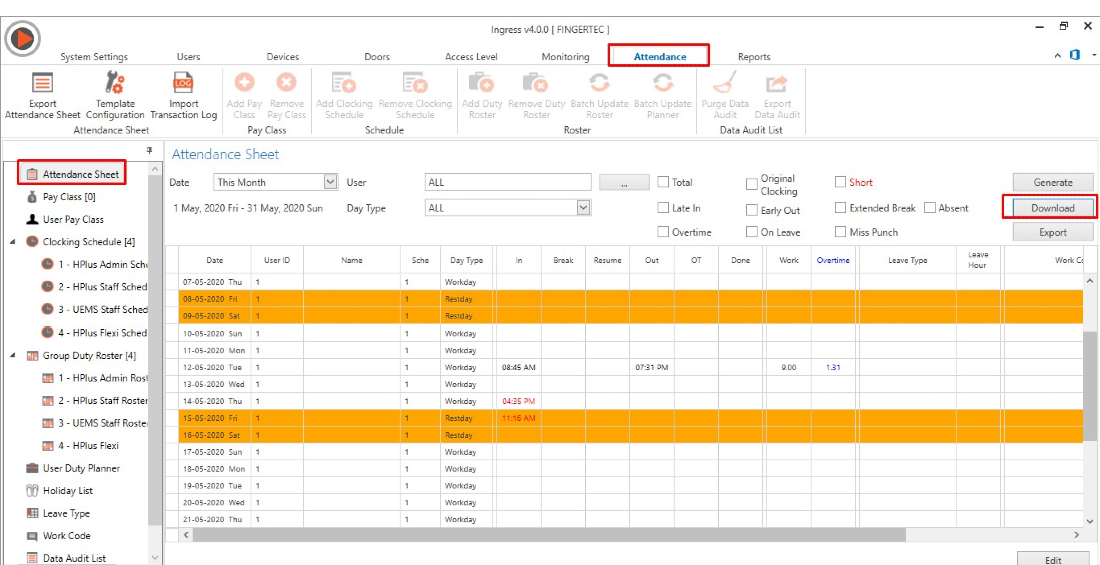 1.Go to the Attendance tab > Attendance Sheet > click Download