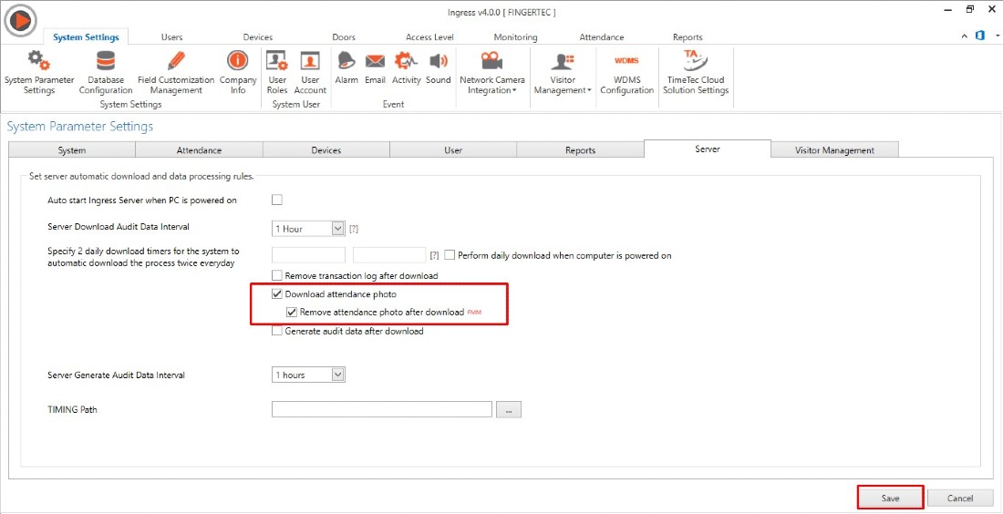 1. Go to System Setting > System Parameter Settings > Server > Kindly configure the auto download logs to either opt for “Server Download Audit Data Interval or Specify 2 daily download timer. You may also refer to the link provided for further details in regards to auto downloading attendance logs: